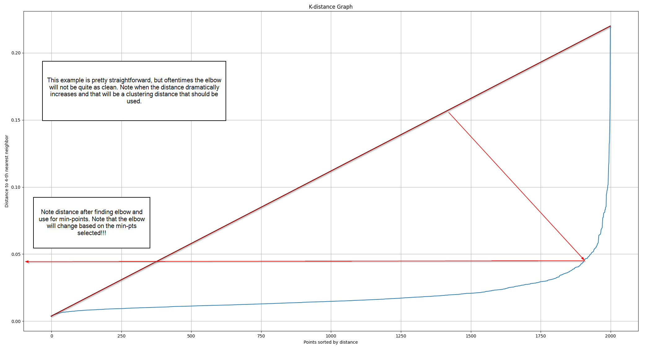 Epsilon (ε): This parameter defines the radius of a neighborhood around a given point. Points within this radius are considered directly reachable from the initial point and potentially part of the same cluster. You can think of epsilon as a circle around which a point is “searched” to find the parameter MinPts. In optimizing the value of this parameter and avoiding repeat trials try to product a k-distance elbow plot and finding the “elbow” of the plot(discussed below).