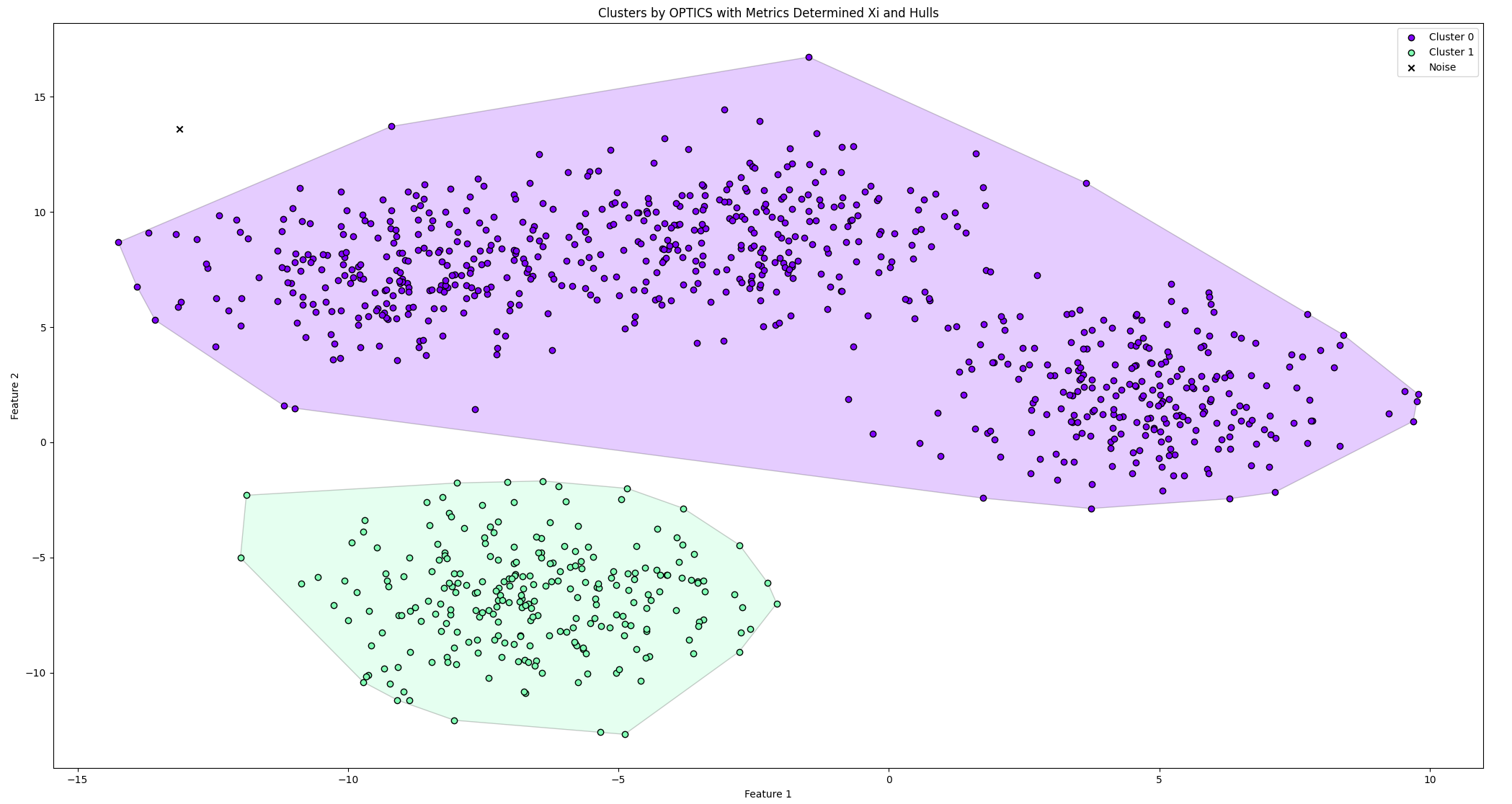 It’s also important to consider that the performance of clustering with different Xi values should be evaluated using metrics like the Silhouette Score, Davies-Bouldin Index, and others discussed earlier. These evaluations can confirm whether the selected Xi value effectively captures the underlying patterns in the data without introducing too much noise or losing significant structures. One such way of evaluating Xi is to evaluate the metrics discussed above with values of Xi between 0.01 and 1 in linspace() of roughly 1000. This way one can determine what the optimal value of Xi is based on each of those five metrics and also average the metrics with different weights to arrive at an ideal clustering. This is performed in the code described in this post. Please see the image below for the Xi values for each metric for the dataset shown above and the resulting “optimal” Xi clustering: