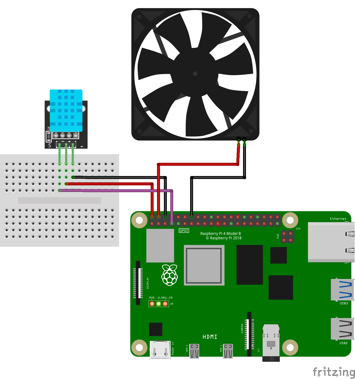 I finally decided to use the Raspberry Pi 4 Model B+ 8gb I had lying around to play around with some sensors. Luckily I took an electrical engineering course in circuits[ECE210 at UIC], which made it pretty straight forward to wire things up. I had also already flashed an OS to the SD card and only encountered a few issues with booting up with the pi in its case(with fan!) and the temperature/humidity sensor plugged in. Please note that setting up VNC Server(RPI) and VNC Viewer(Desktop) will speed this up dramatically. Below is a pretty simple mockup of the connection I used with the Fan’s Power on pin 4[+,5.0VDC] and pin 14[-] and the DHT11 sensor on Pin 2[+,5.0VDC], Pin 6[-], and Pin 7[GPIO7].