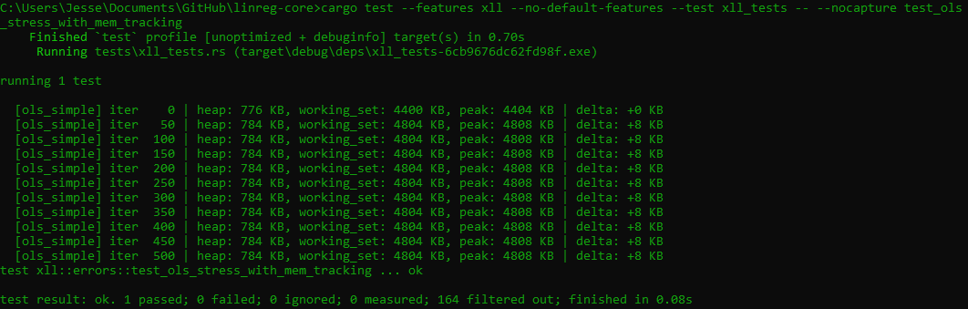 The output is target/release/linreg_core.dll. Rename it to .xll and Excel can load it as an add-in. The entire build uses rustc and the MSVC linker, nothing else.