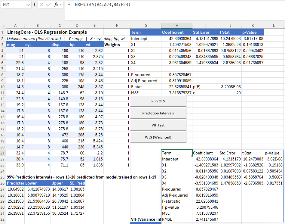 =LINREG.VERSION()in any cell to verify. It should return the library version string.