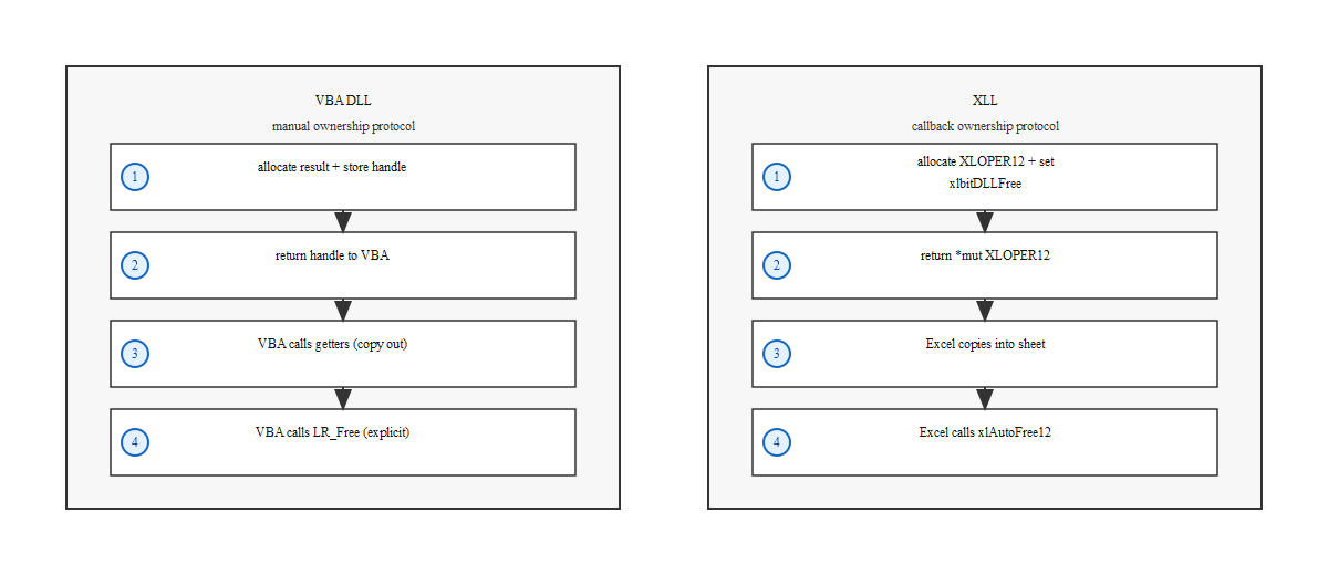 In the VBA article, the same insight appeared in a different form: Box::into_raw for the handle store, Box::from_raw in LR_Free. The mechanism is the same. What changed is the protocol around it. The VBA approach required a handle store and explicit free calls because VBA workflows are multi-step. The XLL approach requires none of that because Excel provides the callback. The ownership transfer is the constant; the surrounding protocol is the variable.